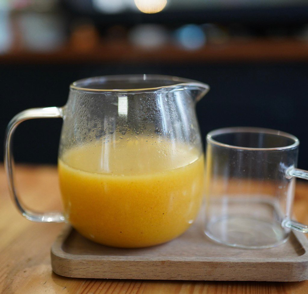 Насичений обліпиховий чай на основі фрешу апельсину, ягід обліпихи з додаванням пюре імбиру прикрашений ломтиком апельсину